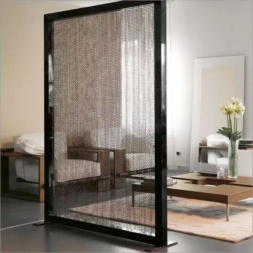 现代屏风不拘一格,设计和材料会用布、纱、金属、玻璃等轻巧的材料,造型和加工更加容易,突破传统单调的色彩搭配,款式多变,多形成透明或半透明的视觉效果,营造出“隔而不离”的感觉。