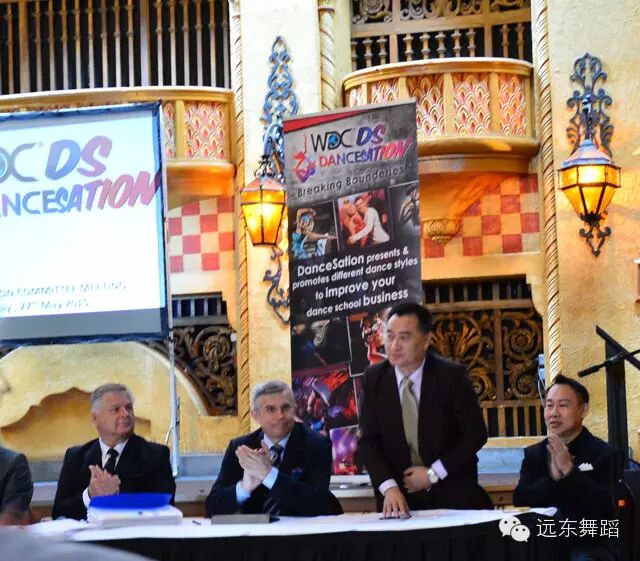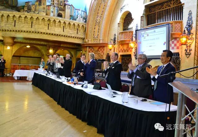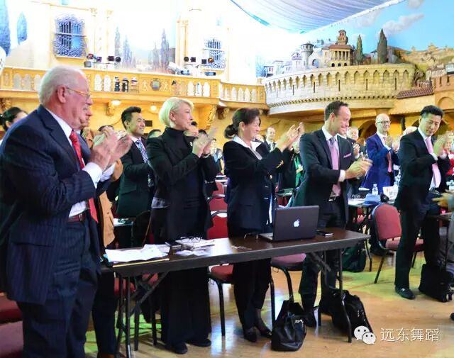 5月27日上午10:00,世界舞蹈总会WDC在冬季花园西班牙厅召开教师委员会会议。张相国担任该委员会执委还不到一年,第一次参加此会议就被安排上主席台就坐。这是中国舞界30年来第一次有人坐上WDC年度会议主席台(中国之前多年是见席会员身份)。张相国此光鲜面孔第一次出现在这唯“舞界大咖”不能的主席台上时,引得近百个会员国代表互相交换着不解的眼神儿。接下来WDC副主席、教师委员会主席斯温向与会代表隆重介绍、推荐了张相国。这时全场代表才恍然大悟,随之报以热烈佩服的掌声。本评论员认为,张相国坐上黑池年度会议主席台意义非常大——中国在国际舞界有了面子、有了地位、有了史无前例的风光。