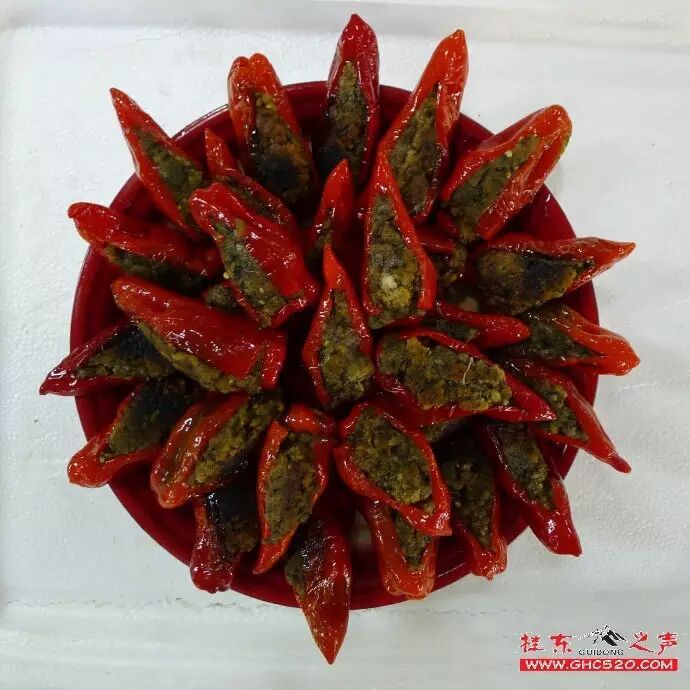 米粉续辣椒,也叫“辣椒嵌米粉”,饮誉省内外的桂东一道传统特色的家常名菜。其加工主要是挑选肉厚、色紫红或红灿灿、个儿大的新鲜辣椒,剖开一个口子,去掉里面的辣椒籽、辣椒囊,然后将煮熟拌好的糯米粉等镶嵌进里面,再投入到小油量的锅中,中火热油煎熟,出锅即可食用。
