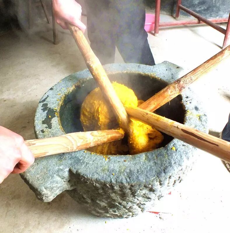 桂东大禾糍,又叫“黄糍粑”,是桂东历史上流传悠久的一种名吃。千百年来,曾以“桂东贡品”的面貌示人。其生产制作工艺比较复杂,加工程序很多,一道道工序环环相扣,且有较高的技术含量,主要大致分为熬碱水、配米、磨浆、蒸熟捣合、成型几个步骤。桂东黄糍粑无任何添加剂,味美香甜、柔韧润滑、色泽鲜黄、烹调方便,蒸、炒、涝、煮、烤均可,加上瘦肉丝、大蒜、香菇等佐料炒食或煮食味道更佳。不仅是招待客人的美味佳肴,也是给人送礼的佳品。