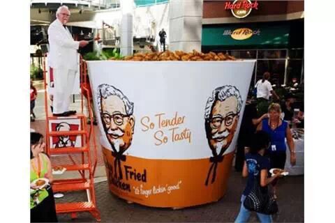 在肯德基庆祝其11种药草和香料配方诞生的70週年会上,他们同时提供了2493.35磅的炸鸡桶给路易斯维尔的市民,并且处造世界史上纪录,就是全世界最大的炸鸡桶。