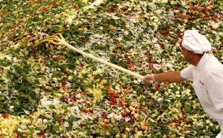 2007年9月29日,西班牙普尔皮,一名厨师制作蔬菜沙拉。这份沙拉由总重量超过6.5吨的多种蔬菜制作而成,创下新的吉尼斯世界纪录。