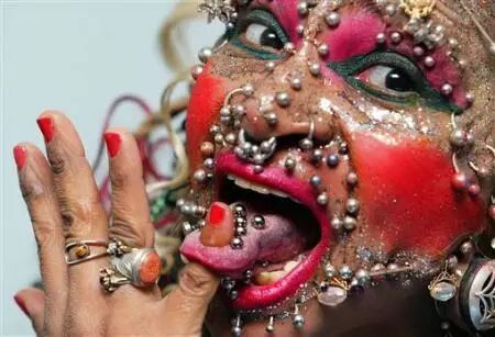 2003年11月11日,英国伦敦泰特美术馆,巴西女子伊莲恩·戴维森展示身上刺环。戴维森全身有超过1,903处环孔,是世界上身体穿刺最多的人。