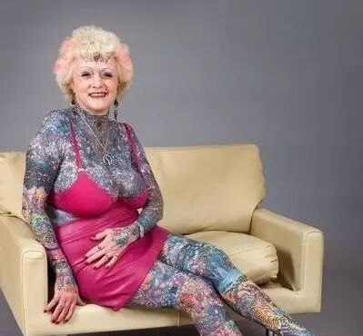 2009年5月15日,西班牙希洪,72岁高龄的英国妇女伊索贝尔·瓦雷在“‘II Expotatoo”纹身博览会上摆姿势。她是“纹身最多的老妇“吉尼斯世界纪录保持者。