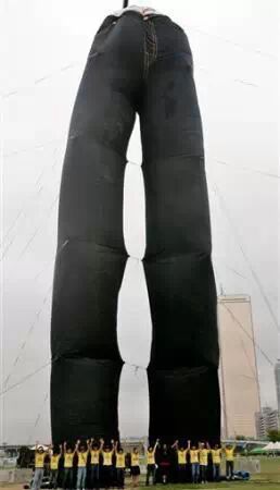 2005年5月1日,韩国首尔,模特们在巨型牛仔裤前留影。该裤子长28.09米,被载入吉尼斯世界纪录大全。