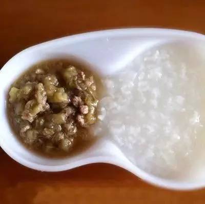 腌好的肉泥铺在茄子上蒸熟,然后取茄泥和肉泥捣烂配白粥吃即可