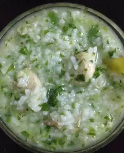 3、大米洗净熬粥,加入适量鸡汤,鸡肉炖至粥黏稠状加入芹菜末在炖十分钟即可
