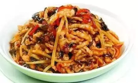 4大勺少留底油,下葱、姜、蒜、黄瓜片、冬笋片炒几下,放炸好的肉段,再把对好的汁卤泼入勺内,颠翻几个个,滴香油出勺装盘