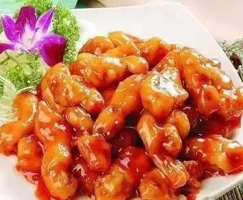 4、锅留底油,烹入糖醋汁,倒入肉片,翻勺,淋香油出勺即可。