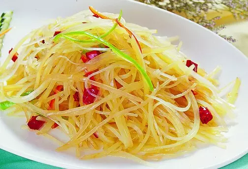 2、开大火下入青红椒,翻炒几下,放入土豆丝,翻炒1分钟左右,放入白醋,生抽,油辣子翻炒几下再放入盐,继续翻炒,炒2-3分钟左右,土豆丝上色后放入鸡精关火盛出装盘即可。