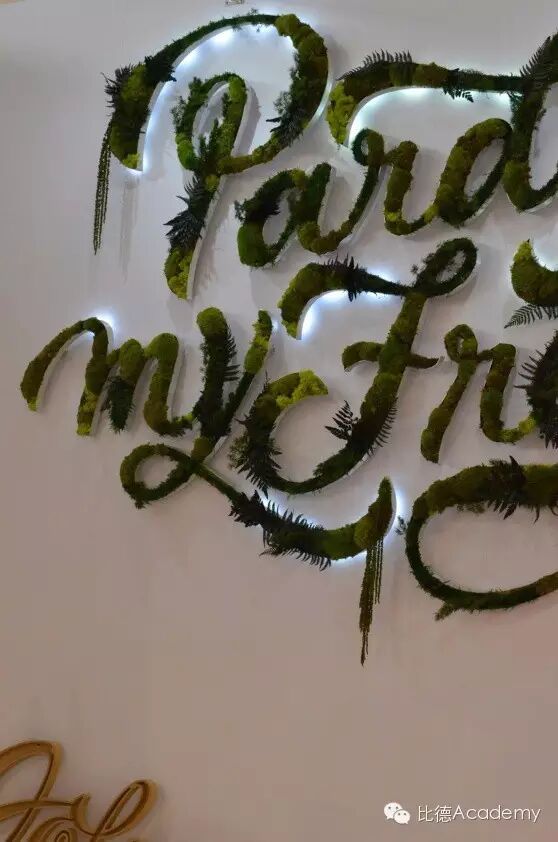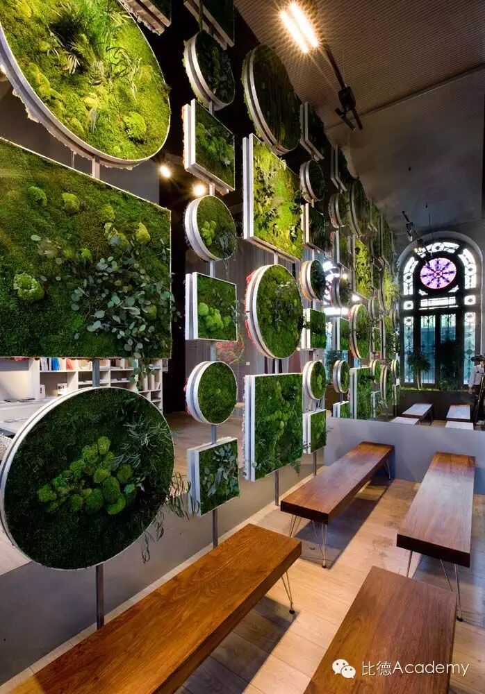 室内垂直绿化,作为休息、展示、交流区域的背景墙。植物造型曲线变化丰富,富有流动感,空间层次上错落有致,灵动变化。