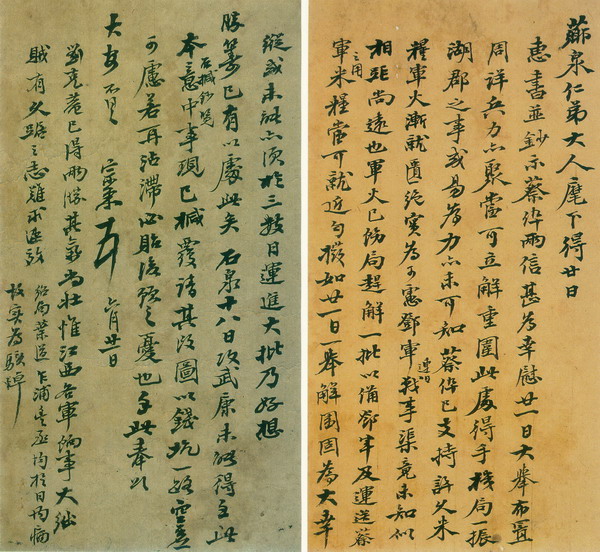左宗棠,自幼聪颖,为道光举人。太平天国起义爆发后,由好友胡林翼保荐,先后入湖南巡抚张亮基、骆秉章幕下,为抵抗太平军出谋划策。镇压太平天国后,从事洋务。晚年曾指挥清军收复新疆。又任军机大臣,中法战争时督办福建军务。积极布防并组成“恪靖援台军”东渡台湾。其晚年在收复边疆和加强海防增援台湾方面功勋卓著。芗泉为曾国藩心腹之一。同治元年(1862)攻占杭州后,任浙江布政使。 《左宗棠致芗泉札》,前札开首便称“阁下初入杭城,诸务草创,弟以一手经理百端……”,当是指芗泉率军援浙,攻占杭州之际。时左宗棠当任浙江巡抚并升闽浙总督。该函主要是传达战况,指挥追击分头转移的太平军,情势非常紧急,故此札还注明“辰刻”。而后札则无,且字体亦比前札端正些,反映出前札写得比较仓促,后札比较从容。