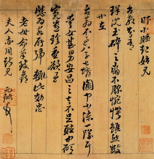 倪元璐书法近黄道周,但气格更胜,比黄道周更为奇崛。黄道周曾谓:“抹蔡掩苏,望王逾羊,宜无如倪鸿宝者。但今肘力正掉,著气太浑,人从未解其妙耳。”可见推崇备至。倪书用笔苍劲古拙,飞扬恣肆,结体出于颜苏,但展脱挺健,得颜苏之精神。此札内容为慰亡,写得沉痛哀婉,但又以通脱之观点为生者解说,言简意深,于平常俗事中见高远之怀。所书结体端正,行笔朴厚而活泼,极为精彩。