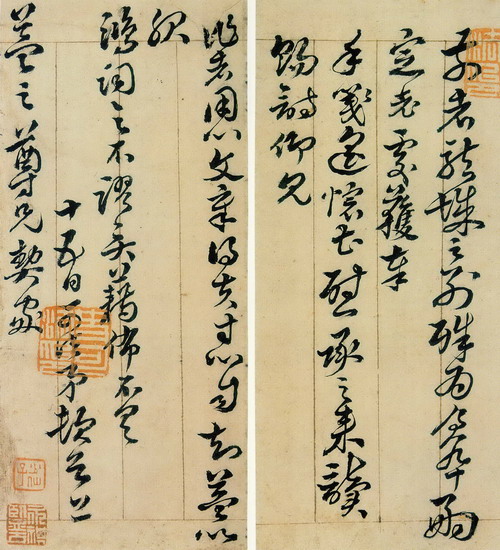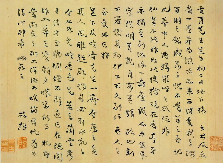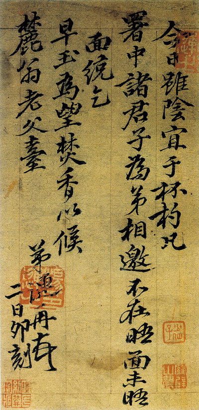 杨涟(1572-1625),字文孺,号大洪。应山(今湖北广水)人。累官至左副都御史,以敢言著称。有《杨大洪集》传世。此两札内容都是邀麓翁相聚,可侧见其时东林士人雅集之逸事。此札书法风格近前方孝儒札,可见他们虽不同世,但志向、操守近,因而笔下自有相通处。但与方札相比,字之棱角更见分明,行笔亦劲利,所谓合而不同者也。
