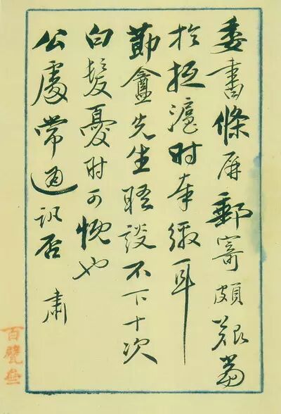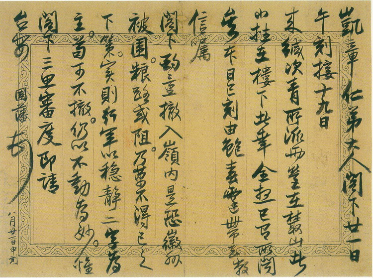 李鸿章,本名章桐,字渐甫,号少荃(泉),晚年自号仪叟,别号省心,谥文忠。因行二,故民间又称“李二先生”。 有《李文忠公全集》。李鸿章致筠仙两函中,有“闽粤无深患,洋务者将以台湾巡抚相属”之语,是台湾自古为中国领土一部分的又一铁证。此点又提升了李鸿章函的历史价值。李鸿章的签名也较特殊,粗看似为“鸿才”连写,但不像彭玉麐签名时把“彭玉”两字合成一字之形,而是仍作两字状,不过“章”字借用了“鸿”字的下部成草书的似章非章之状,这种签名方式至今仍有人使用。