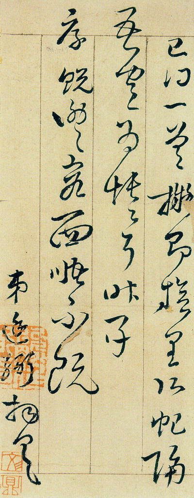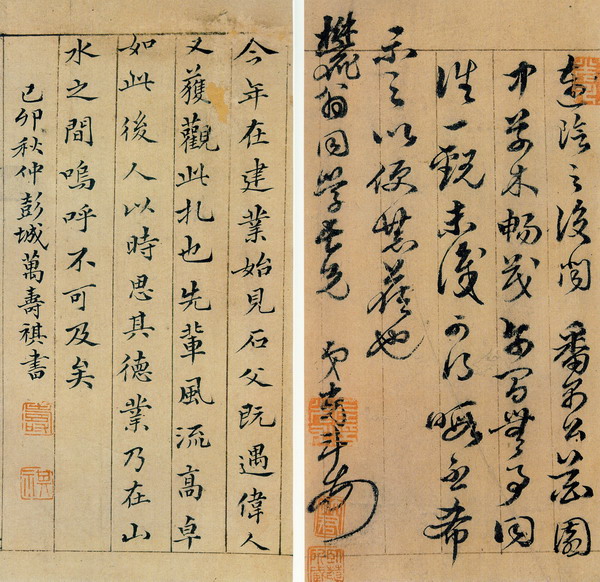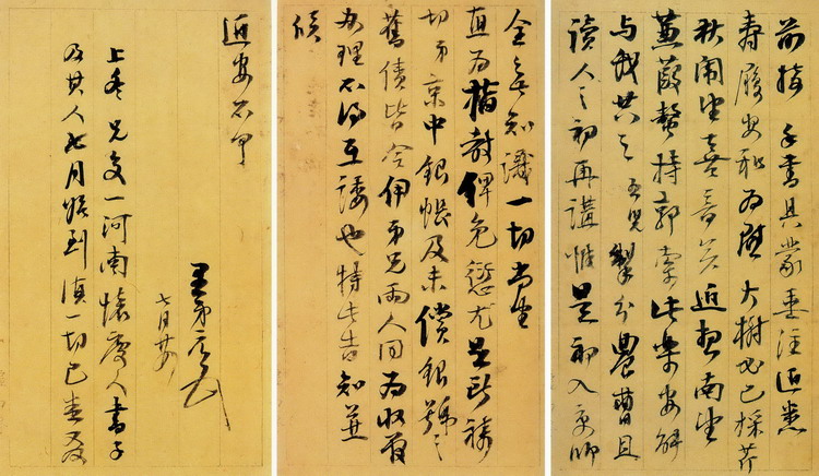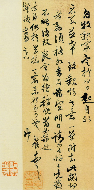 左光斗(1575-1625),字遗直、共之,号浮丘。安庆桐城(今属安徽)人。万历进士,授中书舍人,擢迁御史,奉命办理屯田事务,在北方大兴水利,垦水田,种水稻。泰昌元年(1620)他与杨涟等反对李选侍。又与杨涟同因弹劾魏忠贤而下诏狱、受酷刑死。此札与前杨涟札内容相近,都是意气相投朋友间相约聚会之事。而书法较杨涟字写得飞动多致,甚显才情。其笔势开阔而流畅,风流俊逸。后有明诗人、画家万寿祺(1603-1652)己卯的题跋,于左敬仰之情,犹对日月!亦可见其人在同世之影响。