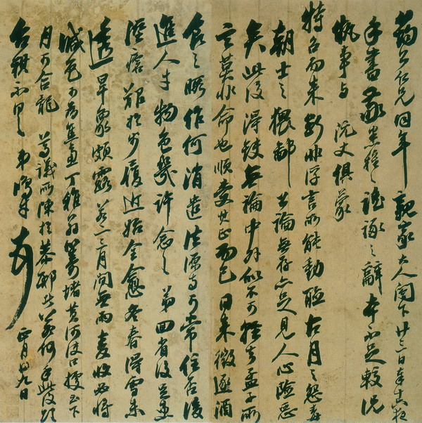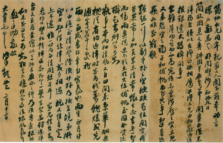 黄道周一生不谐流俗,为人严冷方刚,以文章风节高天下。后复明无望,被俘于南京,不肯投降,在狱中仍从容小楷书《孝经》,被俘翌年(1646)从容就义。他有绝命书,写道:“纲常万古,节义千秋,天地知我,家人无忧。”凛凛然有生气!有《石斋集)》等传世。此札内容即述南明王朝昏庸、江河日下之情形,从中透露出其于时势无奈之心境。其书法奇崛古淡,端严而秀密,诚为佳作。黄道周大字生辣放纵,跌宕奔腾;小字精紧高古,其间反差极大。但无论大小字,其内在气息都以峻拔称,方折分明,字如其人。