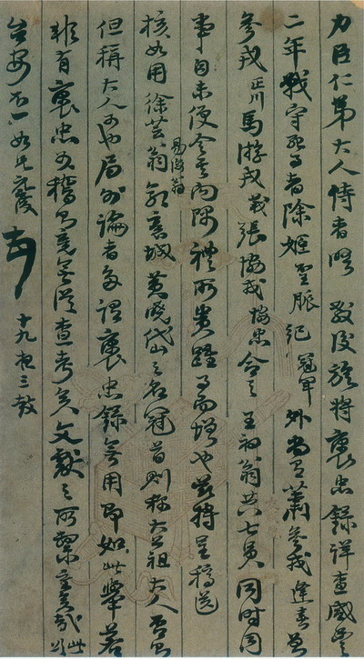 熊廷弼不以书法名世,但其人格、其才能为后世所仰,有《辽中书牍》、《熊襄愍公集》传世。此熊廷弼致友札内容为报自己得差将离别之心情,又对友人厚贶表谢意。寥寥数行,叙事言情,胜于长文巨篇。其书法宗王羲之《十七帖》一路,而行笔迟涩中见心境之愁郁。以字法责之虽非上乘,然字外之音悠远苍凉。见字如见人,使人油然而生敬意,焉能斤斤于点画也。