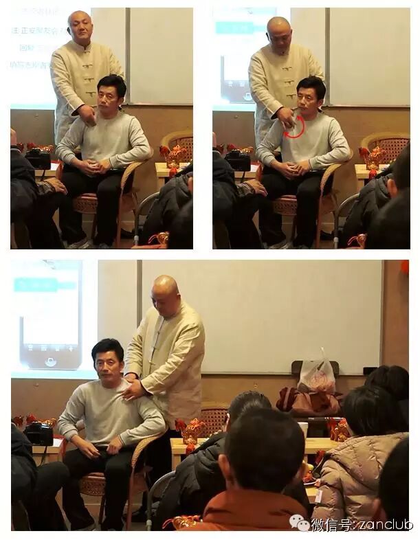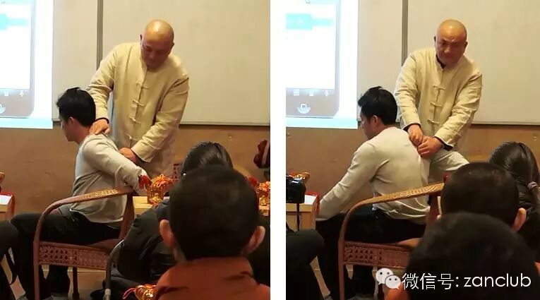 最后一个动作把手背过来,肩胛骨就会翘起来,从肩胛骨的缝这里,用手给向里边塞几下,手就塞到肩胛缝这个地方,塞他三四下。然后,另外一边的手再背过来,同样再塞几下。
