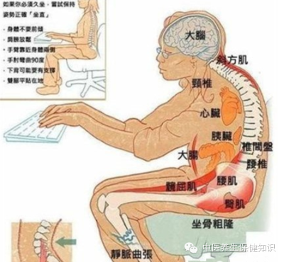 长时间坐着,肌肉燃烧脂肪更少,血液流动的更加缓慢,使脂肪酸更容易堵塞于心脏。长时间坐着与高血压、胆固醇提高有关,而且心血管疾病发生率会倍增。