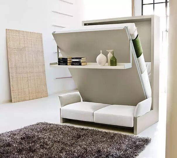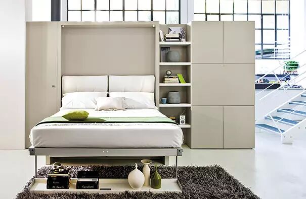图中的这种双人床在折叠之后即可变成沙发和置物架,实用技能又上升2点,肩负起卧室和起居室的双重功能。3平米get!