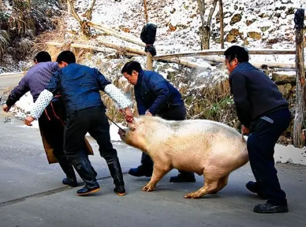 女主人出院后亲戚都来看望,男主人把肥猪宰了招待客人。