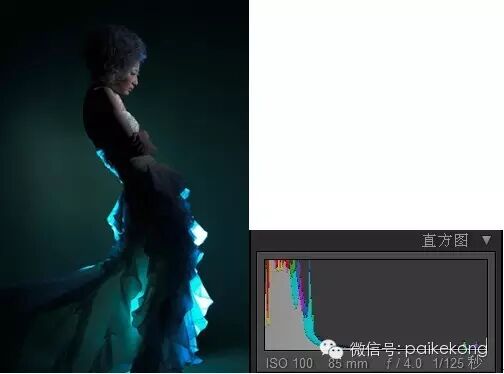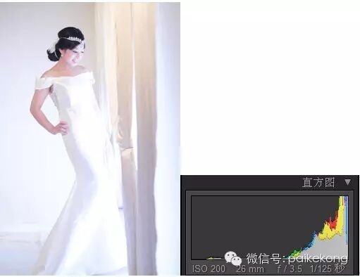 直方图右侧高光区域大量出现溢出(溢出就是常说的死白和死黑,无层次的白和无层次的黑),裙摆的白纱失去了层次,导致曝光过度。