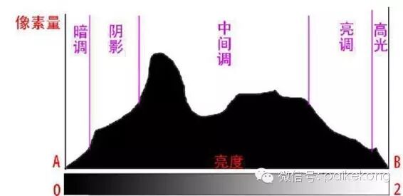 直方图可以看做一个坐标,分为横轴和数轴,波动的区域是峰值,大致可以分为几个区域,暗调、阴影、中间调、亮调和高光。通常我们说一幅照片当高光区域大量溢出时,那么这张照片就过曝了。相反当暗调区域大量溢出时这张照片就欠曝了,再通俗点我们经常归纳为‘左欠右曝'。