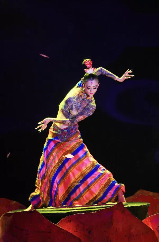 “似妖似仙”这几个字拿来形容杨丽萍自己也非常恰当,妖艳不老,仙气十足。她自己也表示,莲花是中国文化的一种象征,寓意祥和、光明、纯洁、自在,莲花的轻盈也让人联想起女性的娇媚。