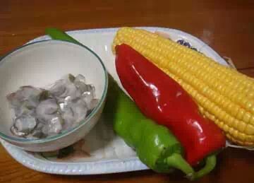 辅料:玉米粒、青红椒、香葱调料:盐、味精、料酒、香油、辣酱、玉米淀粉