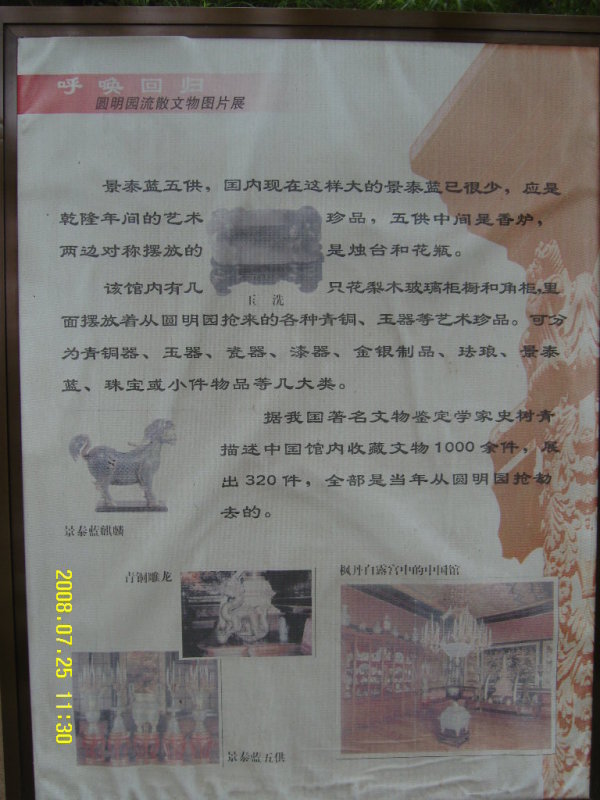 正如圆明园流失文物展结束语所言,被强盗掠走的不计其数,在罪恶之火中化为灰烬的数不胜数,劫后的圆明园的残骸和她屈辱的灵魂,无时无刻不在呼唤着历史的反思!