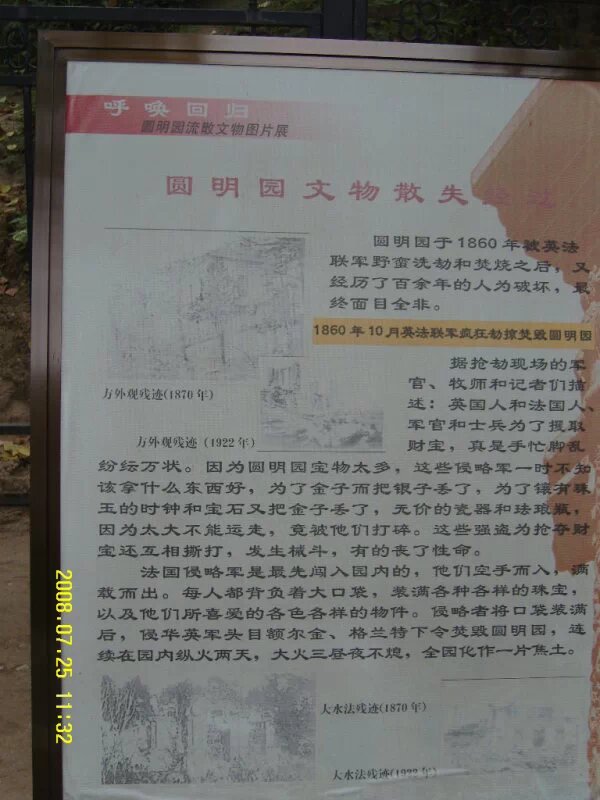 园子还是那个园子——圆明园,只是名字后面多了几个字——“遗址公园”,荷花依旧还在湖中盛开,只是插了个牌子——“古莲区”。可是那名扬世界的皇家园林风采何在?拱桥三十,只存残桥一座,雕栏画柱已成残垣断壁,珍珠玛瑙已是他人项上之佩,珍稀古玩也成了列强们博物馆的陈列品……