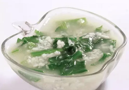 取连根新鲜菠菜100~150g,洗净后用手撕开,粳米100g,放入砂锅,加水800毫升,煮至米烂汤稠加入菠菜,即可食用。