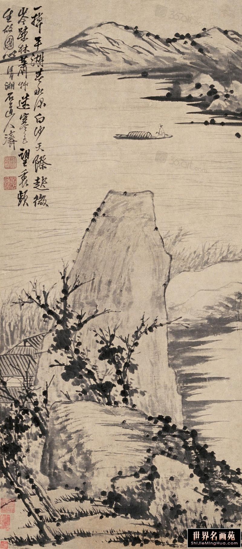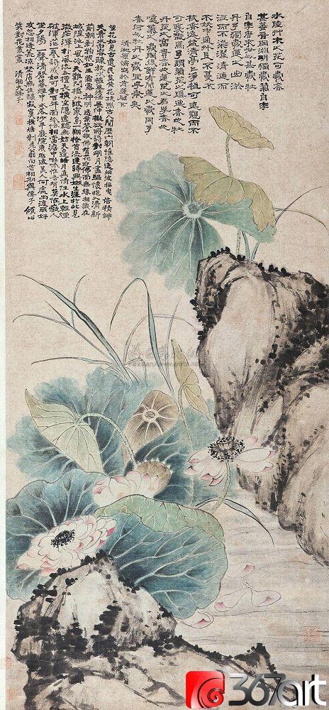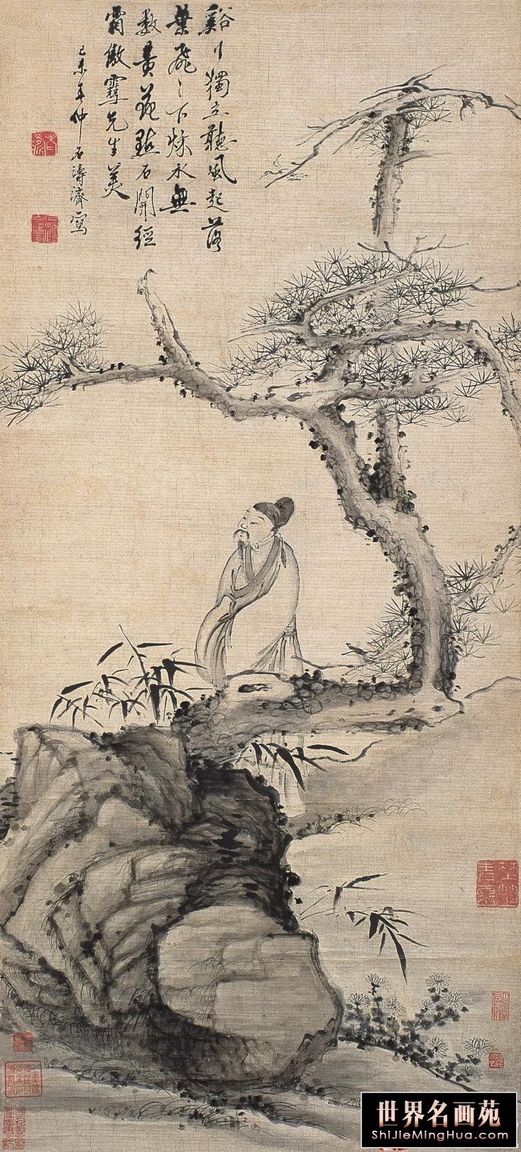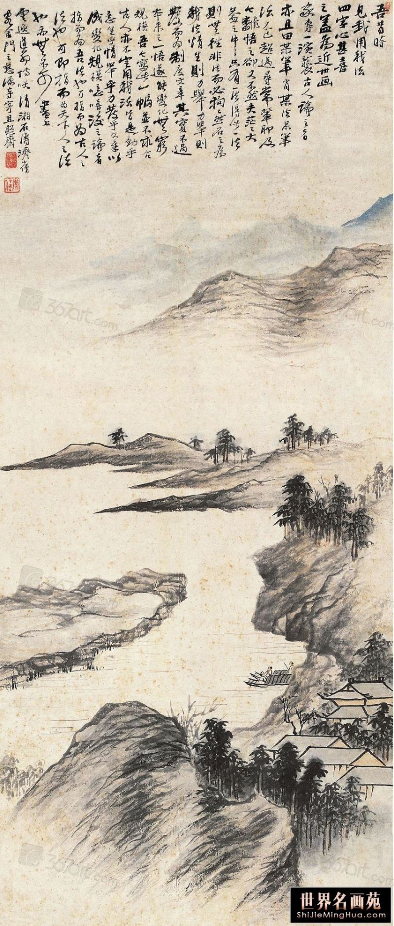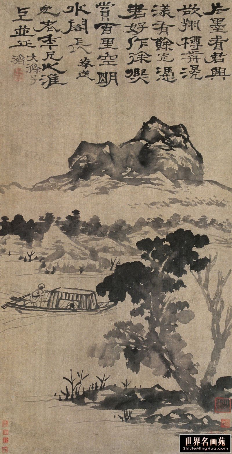 石涛(1642一约1707),清代画家、中国画一代宗师。靖江王朱守谦十世孙,法名原济,一作元济。本姓朱,名若极。字石涛,又号苦瓜和尚,、大涤子、清湘陈人等。广西全州人,晚年定居扬州。明靖江王后裔,南明元宗朱亨嘉之子。幼年遭变后出家为僧,半世云游,以卖画为业。早年山水师法宋元诸家,画风疏秀明洁,晚年用笔纵肆,墨法淋漓,格法多变,尤精册页小品;花卉潇洒隽朗,天真烂漫,清气袭人;人物生拙古朴,别具一格。工书法,能诗文。存世作品有《搜尽奇峰打草稿图》《山水清音图》《竹石图》等。著有《苦瓜和尚画语录》。名言有“”一画论‘、“搜尽奇峰打草稿”,‘笔墨当随时代’等