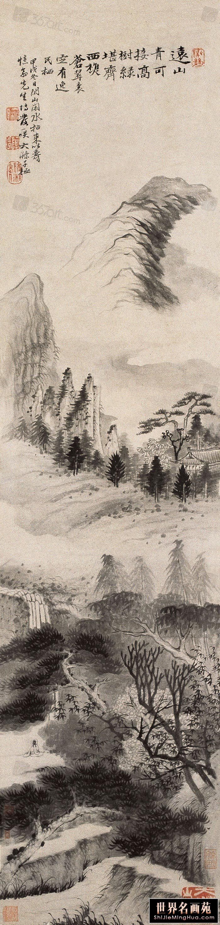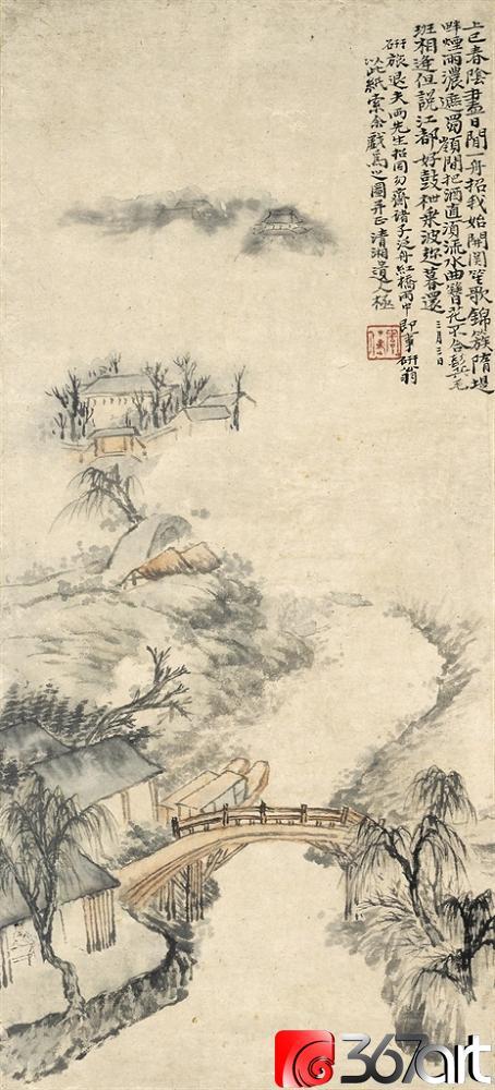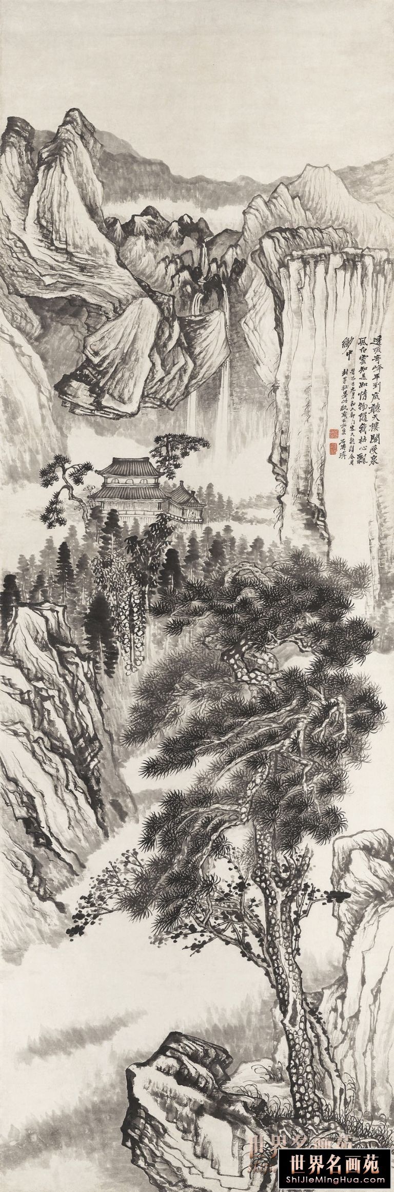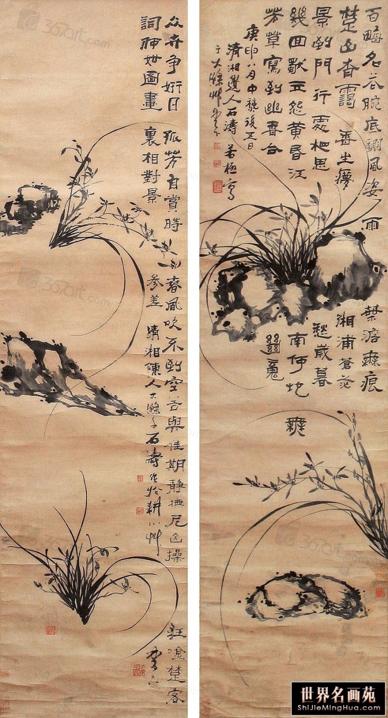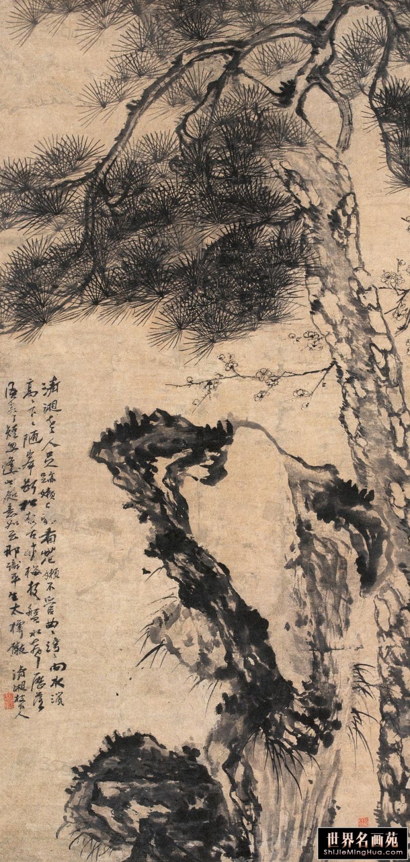 石涛(1642一约1707),清代画家、中国画一代宗师。靖江王朱守谦十世孙,法名原济,一作元济。本姓朱,名若极。字石涛,又号苦瓜和尚,、大涤子、清湘陈人等。广西全州人,晚年定居扬州。明靖江王后裔,南明元宗朱亨嘉之子。幼年遭变后出家为僧,半世云游,以卖画为业。早年山水师法宋元诸家,画风疏秀明洁,晚年用笔纵肆,墨法淋漓,格法多变,尤精册页小品;花卉潇洒隽朗,天真烂漫,清气袭人;人物生拙古朴,别具一格。工书法,能诗文。存世作品有《搜尽奇峰打草稿图》《山水清音图》《竹石图》等。著有《苦瓜和尚画语录》。名言有“”一画论‘、“搜尽奇峰打草稿”,‘笔墨当随时代’等
