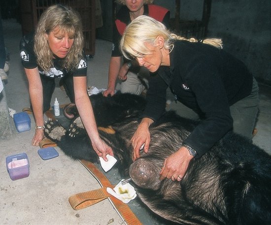 抢救月亮熊,左边为谢罗便臣女士。右边是郭慧玲医术总监(扎辫子)