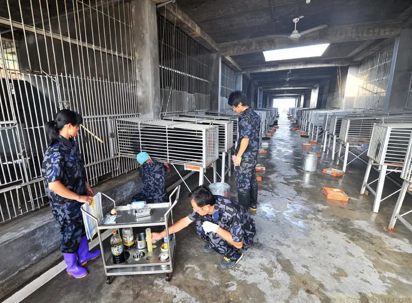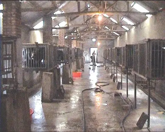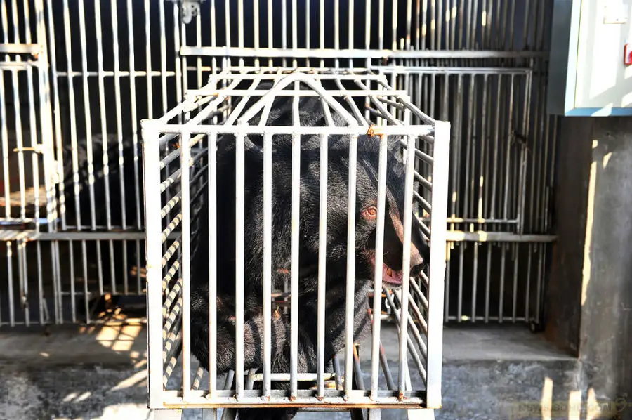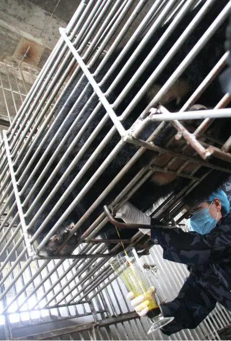 天亮后,带班的老张说领我去熊房看看。来到一个有几千平方米的高大建筑里,里面很空旷,平放着六个笼子,每个笼子里都有一只萎靡的黑熊。奇怪的是它们身上都箍着一个明晃晃的像兜肚的东西。老张告诉我,“这是取胆汁用的,现在的熊胆汁价格是每克300元。”他带我来到第一个笼子跟前,打手势告诉我:“采胆汁开始了。”