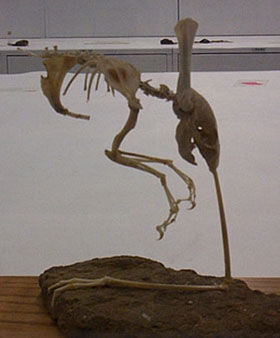 特点是有着很长的脊梁骨和象鸟一样的头骨,据说体长有近4米,但不知是我们看到的这部分长4米;还是算上断掉了的部分,总长4米;就连这个是怎么断掉的,这些都没有详细的资料。不过,根据海外的资料记载这个脊梁骨有两个人加起来那么长,我们可以知道眼前的这部分有4m。很遗憾,这个标本已被人偷走,已经不存于这世上了。