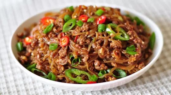粉丝 50克、猪肉 150克、尖椒 1个、红尖椒 1个、小葱 1棵、姜 1块、蒜 5瓣、豆瓣辣酱 1大勺、料酒 2小勺、生抽 1小勺、老抽 1小勺、白糖 少许、水 6大勺、鸡汁 2大勺、花生油 2大勺加老中医号:wxhealthylife 每天帮你把把脉!!!