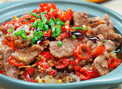 牛肉 300克、粉丝 1小把、泡红椒 4个、食盐 2克、白胡椒粉 5克、料酒 10克、淀粉 3克、姜 5克、蒜 10克、细香葱 1根、生抽 5克、蚝油 5克、植物油 20克
