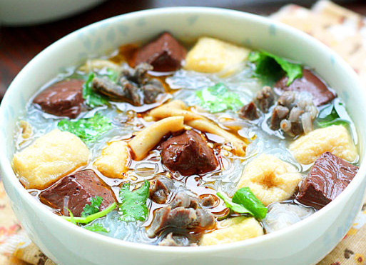 鸭肠 100克、粉丝 1把、油豆腐 50克、鸭血 200克、鸭胗 2个、葱 适量、姜 适量、香菜 适量、高汤 1碗、香醋 适量、胡椒粉 适量、生抽 适量、色拉油 适量