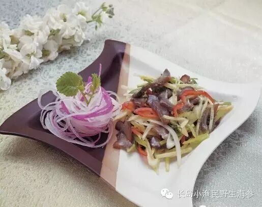 2.全部调料放盆内调匀,放入海参条及配料拌匀,装盘即可。