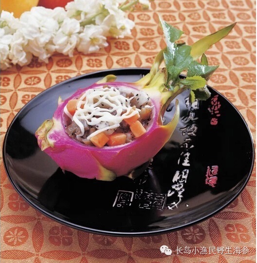 2.海参丁汆水后洗净,加火龙果丁、木瓜丁、沙拉酱拌匀,装在火龙果壳内即可。