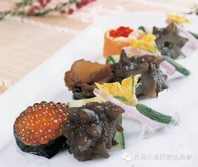 2.将海参、鲍鱼改刀,装盘,点缀三文鱼片、紫菜卷,带各种调料上席即可。