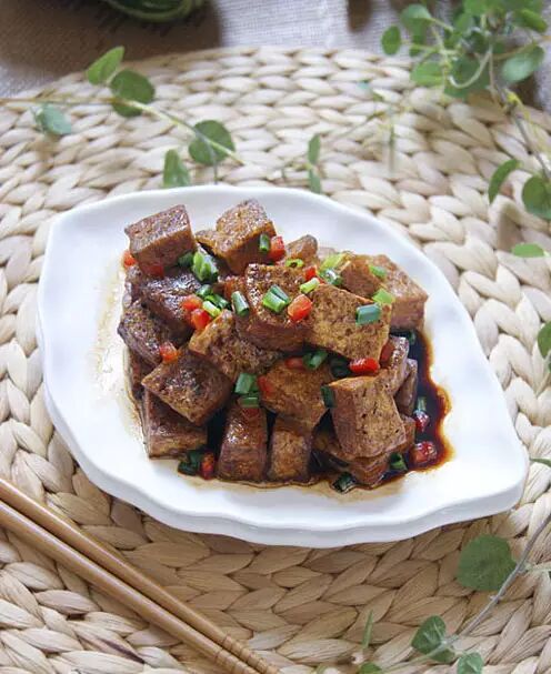 老豆腐500克、红椒半个、生姜2片、香葱2根、可乐1碗、老抽1汤匙、盐1茶匙、鸡精1茶匙