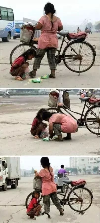 一个浑身上下黑乎乎、脏兮兮的小女孩在马路上发现2包被车碾过的方便面,就和妈妈下车找空塑料袋,把散落在地上的方便面残渣小心翼翼地捡了起来。