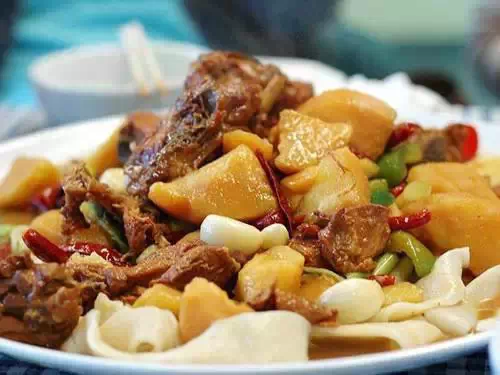 2、做法:土豆去皮洗净切成块,青红辣椒洗净切滚刀块,鸡肉洗净切块,鸡肉用葱段、姜片、料酒腌制去腥味。在热油锅中爆香蒜头、干辣椒、花椒、姜片、葱段,放入豆瓣酱炒出红油之后倒入鸡肉翻炒,加入酱油、老抽、糖、盐,待鸡肉炒熟上色后,加入土豆炒熟,倒入开水,没过鸡肉和土豆,中火慢炖收汁,汤汁收的差不多时,倒入青红辣椒炒熟,用另一个锅煮面条,熟了之后放在菜里即可。