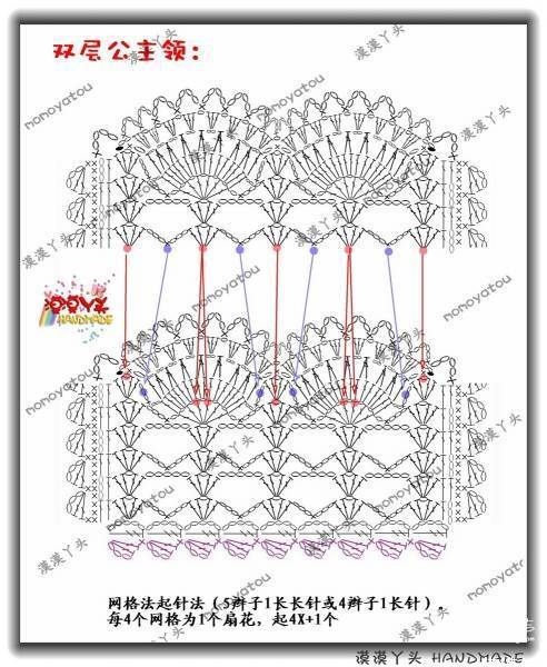 【花稚.公主】发贴后,不断有姐妹在问双层公主领的钩法,为方便有需要的姐妹,我绘制了完整的领圈图解,并拍照做了图文详解。如果孩子年纪小,可将图解中的网格起针由“5辫子1长长针”改为“4辫子1长针”,以缩小些脖围大小;根据所用线材粗细和钩针大小,自行按4X+1去加减扇花数目哈;按自己的喜好,还可以加缀珍珠、系带等。