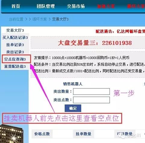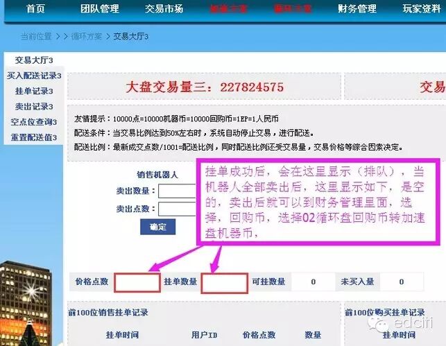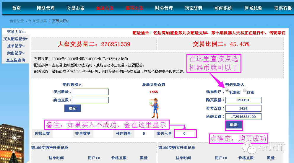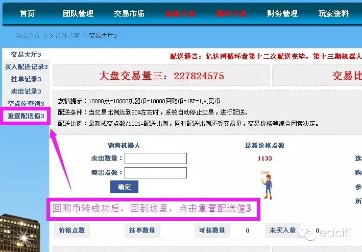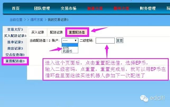 到此,整个重置循环盘配送值,购买加速盘机器人成功,加速盘配送值达到2次后,将加速盘机器人类似循环盘一样直接卖出,卖出后无需重置,将加速盘内的EP币转入主盘,再将主盘EP币转入循环盘继续购买循环盘机器人参加配送,或者转如盘外EP内提现,加速盘内回购币转让主盘回购币,购买主盘的机器人。