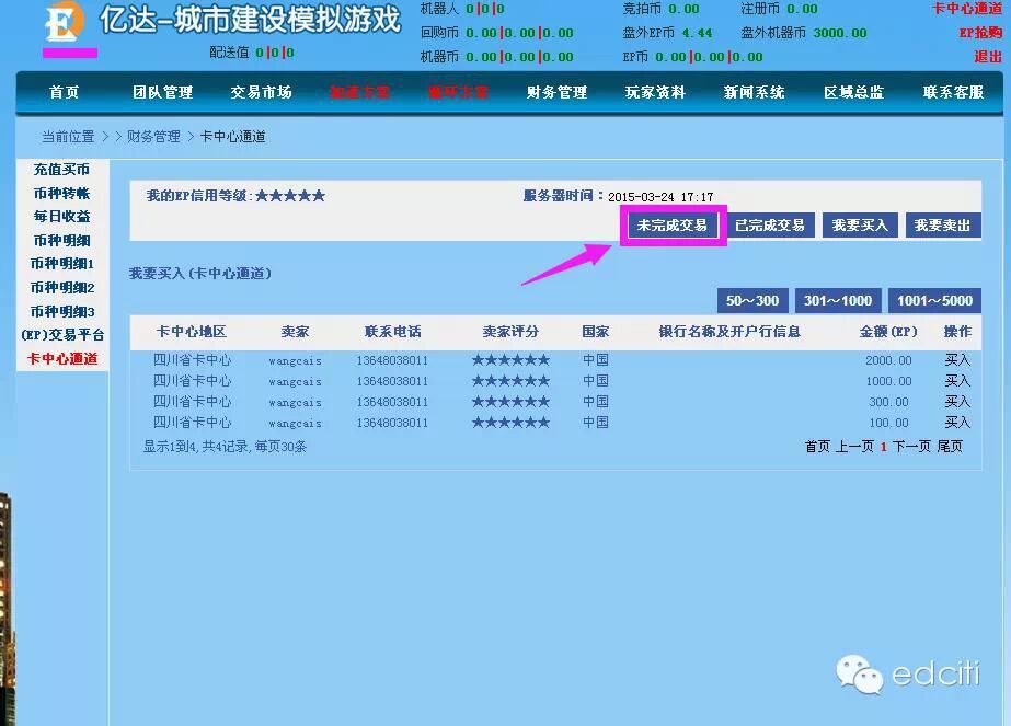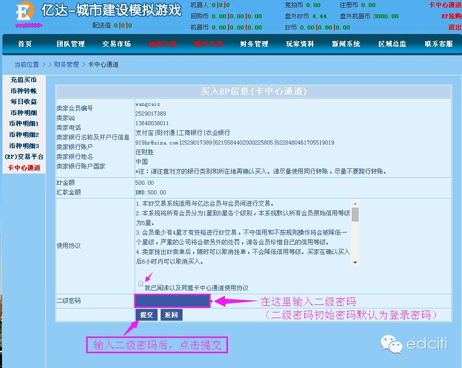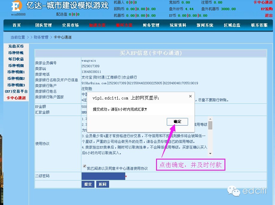 按照上图,确定已付款后,耐心等待卡中心收款后确认,EP即可到账,如果在6小时内不能及时完成付款,请你马上点击“中止”,否则将影响到你的信用。